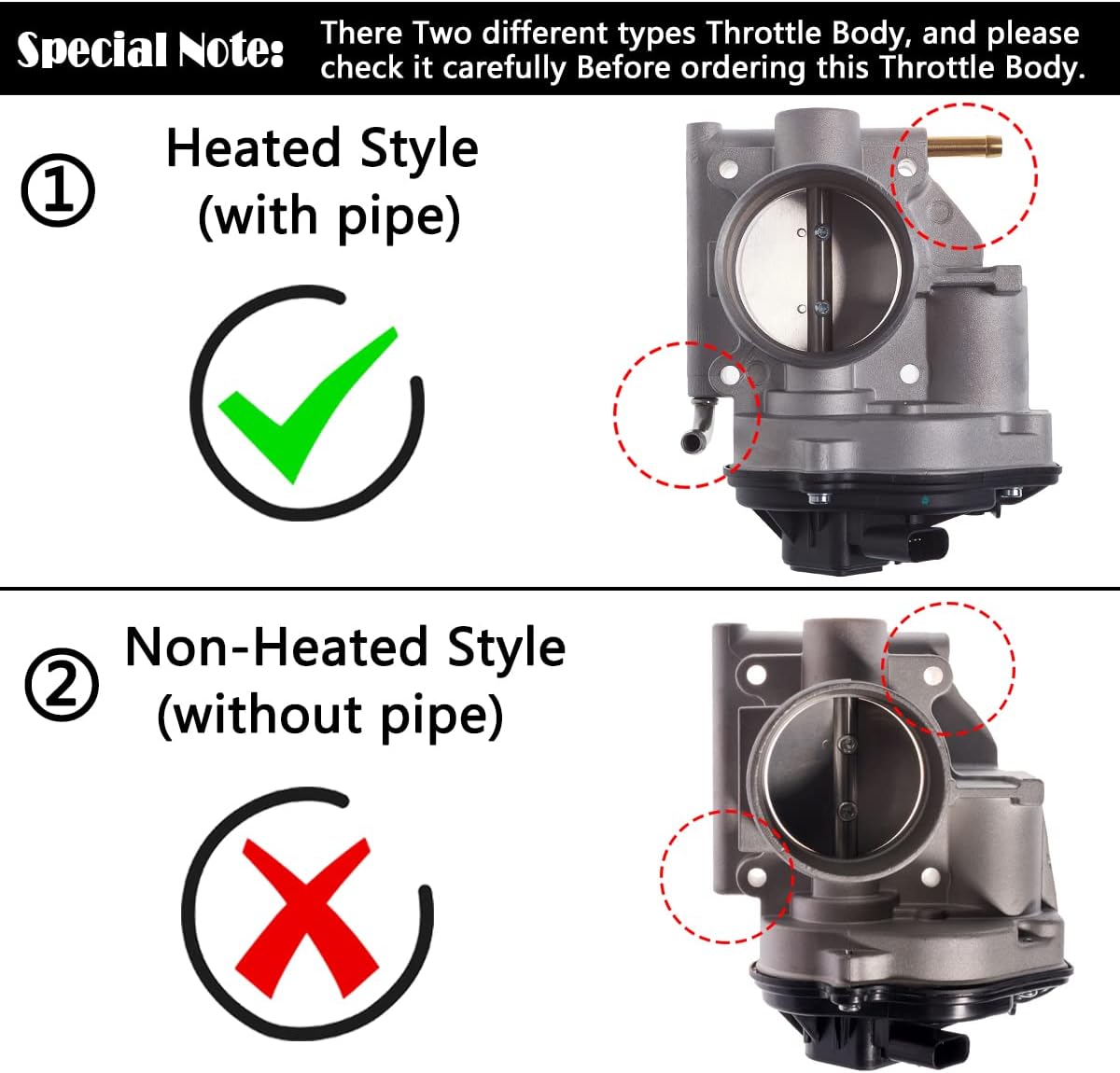 About usInc. is well-known as a leader in providing quality auto parts to the aftermarket.Innovation, engineering expertise, superior quality, meticulous testing, unmatched customer service, competitive pricing, and brand integrity, are at the heart of every AUQDD part.At AUQDD, we take pride in the quality of our products and in your satisfaction.Look forward to becoming your first choice brand of Throttle Bodies.Product Fitment Information:Compatible With Fo-rd ===========2005-2007 Five Hundred 3.0L [Heated Style (with pipe)]2005-2007 Freestyle 3.0L [Heated Style (with pipe)]Compatible With Mer-cury ===========2005-2007 Montego 3.0L [Heated Style (with pipe)]Package Includes:1 x Electronic Fuel Injection Throttle Body Assembly - TB1016 (12-Month Warranty)Part SpecificationsConnector:6 Pin MaleComplete Throttle Body Assembly Includes:Throttle Actuator Pre-assembledIdle Air Control (IAC)Throttle Position Sensor (TPS)Throttle Body Installation NotesAfter replace the throttle body, the idle speed is usually high, unstable or the engine fault light on.This is because the newly installed throttle body parameters are inconsistent with the original.Now you need to match the throttle to the computer. The matching process actually is to clear the original memory of the ECU, and restart the self-learning.When the computer cannot match, you can use the manual method to match.
