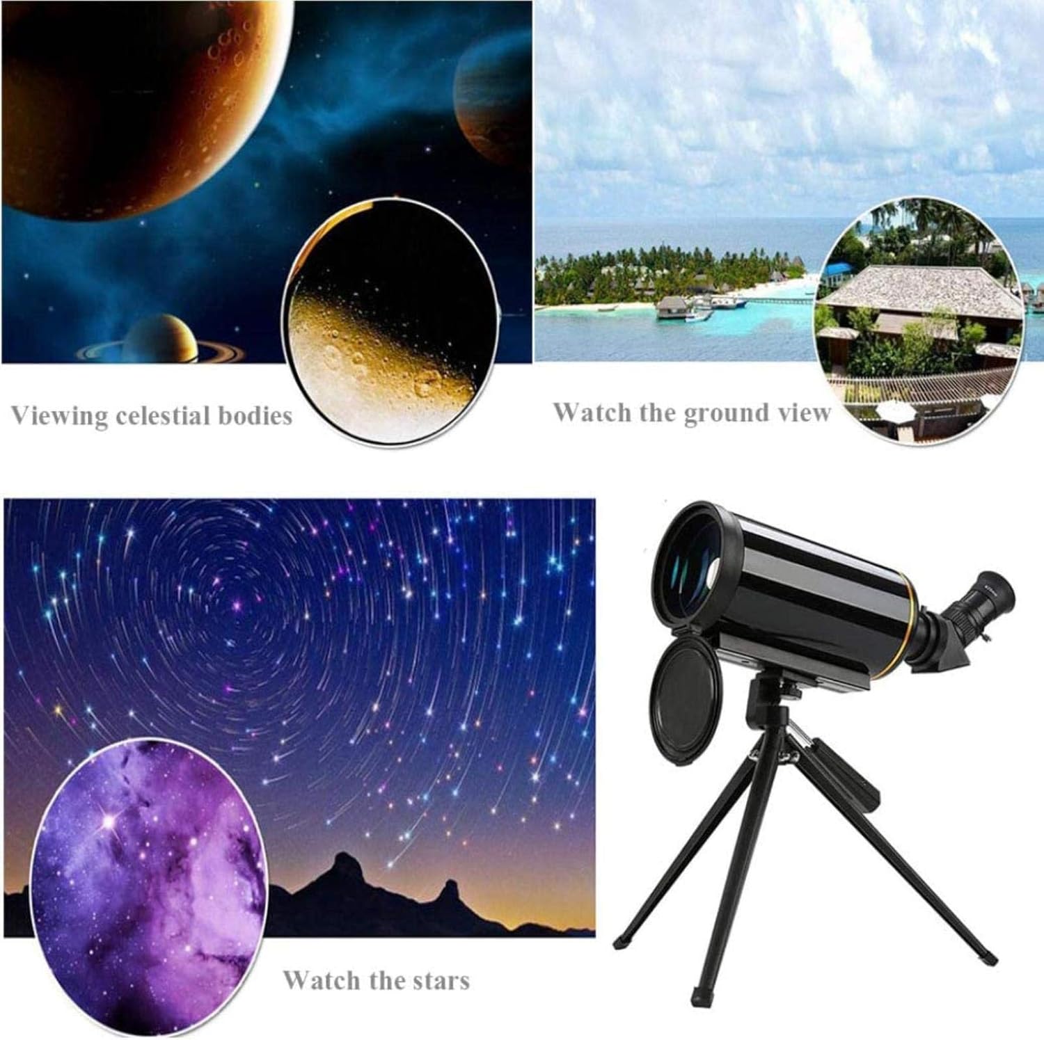 Telescope / astronomical telescope suitable for indoor and outdoor use Astronomical telescope, telescope for observing the universe and the earth The telescope is a cost-effective telescope with bright image quality and high magnification power. Ideal for children, beginners, and Abrian astronomers to explore the sky, moon, and planets. You can enjoy the scenery on either side or during the day. Telescope specifications -Aperture : 90mm (3.5in) -Focal length : 1000mm (32.8in) -Focal ratio : F11.1 -Eyepiece 1 :25mm(0.98in) -Eyepiece 2:10mm(0.39 in) -Magnification 1:24X -Magnification 2:60X -Maximum magnification : 360 -Zenis mirror : 45° prism -Resolution : 1.29 Package includes : -1x carrying bag -1x aluminum alloy tripod -1x telescope tube- 2x eyepieces (10mm , 25mm) -1x CD -1xMoon filter -1x45° prism -1x user manual ( Chinese may not be supported )